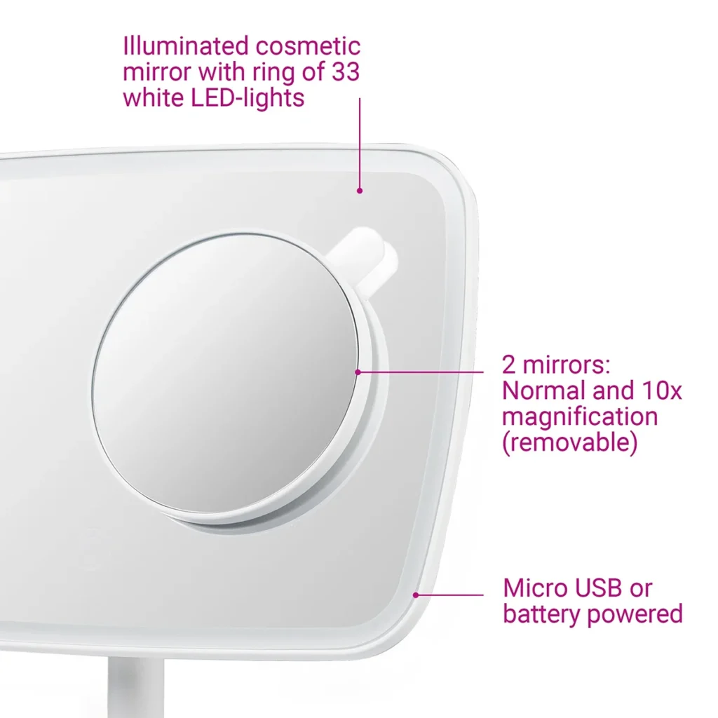 CM 848 osvijetljeno kozmetičko ogledalo pruža optimalne uslove osvjetljenja koristeći ravnomjerno prstenasto osvjetljenje od 33 super svijetle bijele LED diode.