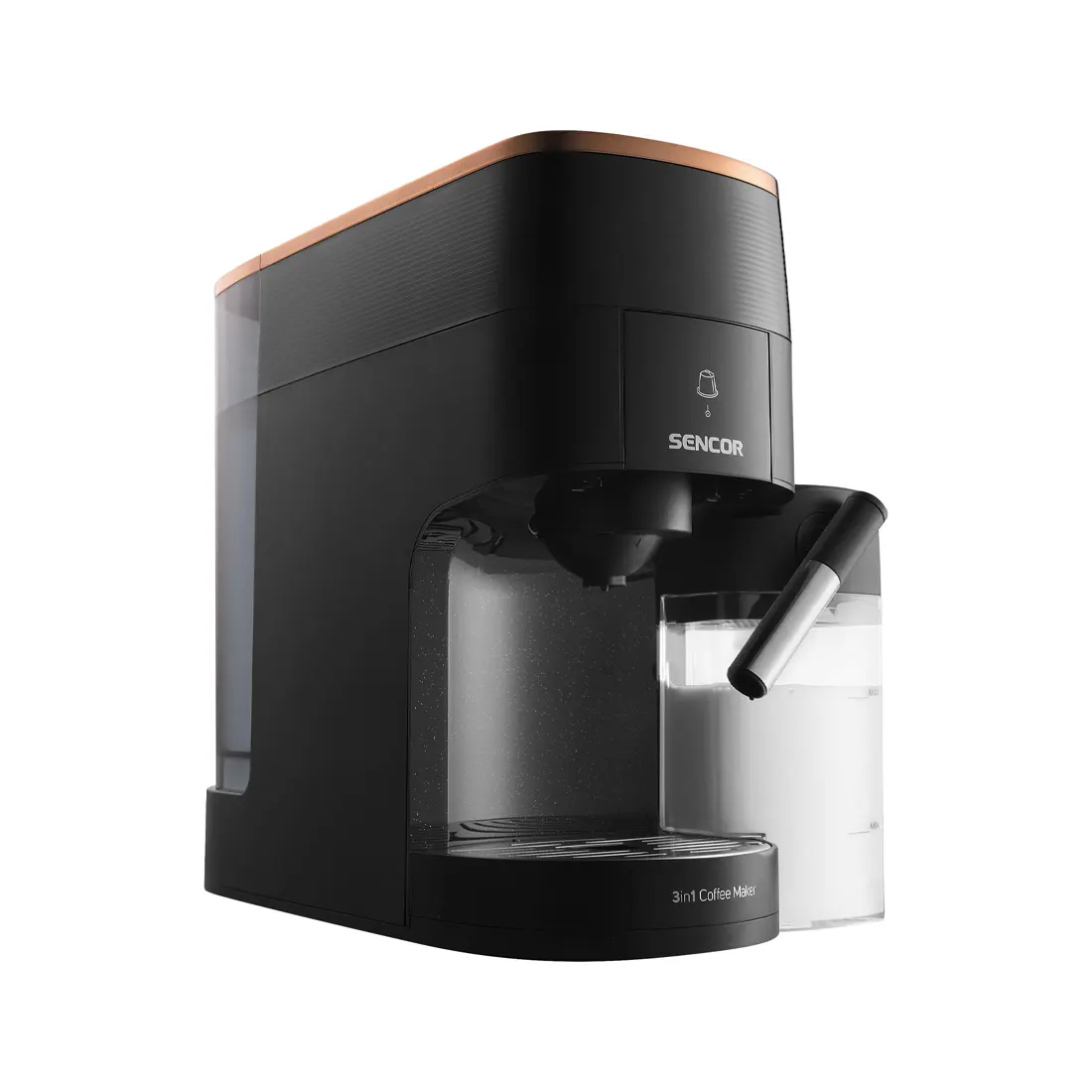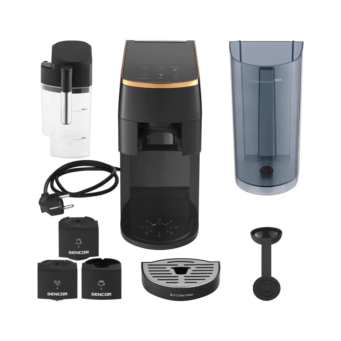 Otkrijte beskrajne mogućnosti pripreme kafe sa Sencor SCC 3000BK više-kapsulnim espresso aparatom, koji će pripremiti ukusnu kafu jednostavno, brzo i visokog kvaliteta. Birajte između širokog asortimana Nespresso® Original*, Nescafé® Dolce Gusto®* ili bilo kojeg brenda mljevenih zrna, ovisno o vašim željama. Displej u boji olakšava odabir omiljenog pića jednim dodirom. Profesionalni kvalitet potkrijepljena je snažnom pumpom od 19 bara i Thermoblock sistemom za grijanje vode. Aparat za kafu opremljen je spremnikom za automatsko pjenjenje mlijeka i jednostavno čišćenje s automatskim ispiranjem. Zbog svoje kompaktne veličine, možete ga nabaviti i za manje stanove.